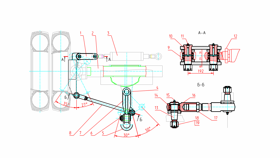 1 - шатун; 2 - мост; 3 – гидроцилиндр поворота колес; 5 - дышло; 7 - водило; 8 – тяга поперечная; 9, 14 - подшипник; 4, 6, 10, 13 - пальцы; 11, 15 – пресс-масленка; 12, 17 – стопорная гайка; 16 – наконечник; 18 - гайка; 19 – шплинт.