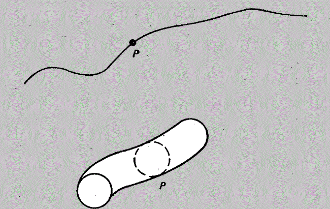 На этом рисунке показано, что измерение P (изображенное в виде кривой) имеет 2 размерности при близком рассмотрении, а на больших расстояниях видно только одно. Именно так Оскар Клейн объяснил почему мы еще не обнаружили пятое измерение.