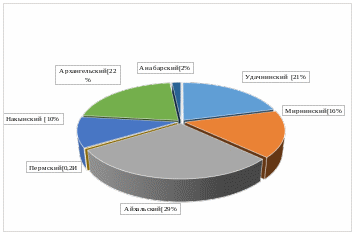 Рис. 4. Распределение балансовых запасов алмазов по алмазоносным районам России, % (Пивченков В. Ю.)