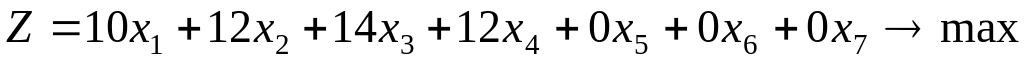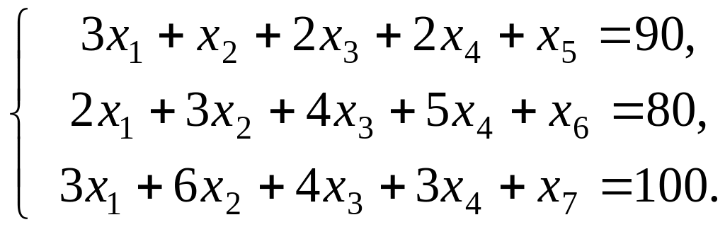 Перейдем к канонической форме задачи линейного программирования, введя дополнительные (балансовые) переменные х5, х6, х7, означающие возможные остатки ресурсов сырья: