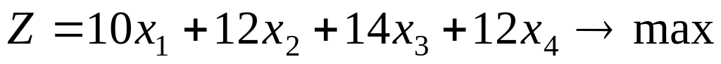 Решение. 1) Составим экономико-математическую модель задачи. Обозначим через х1, х2, х3, х4 количество весовых единиц четырех видов продукции, которые планируется изготовить. Тогда суммарная прибыль, полученная от реализации выпущенной продукции, будет равна: