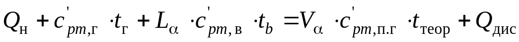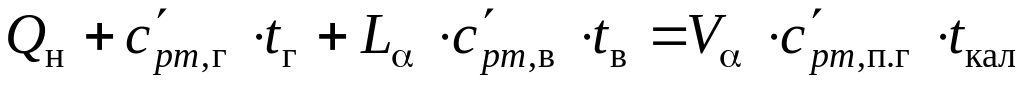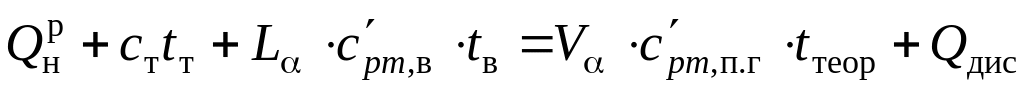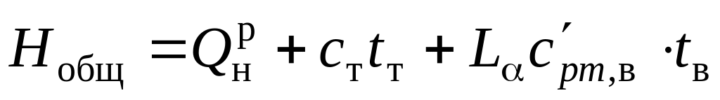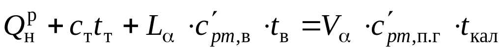 Для расчета калориметрической и теоретической температуры горения по тепловому балансу процесса горения используют уравнения теплового баланса, в которых в левую часть входят химическая и физическая теплота топлива и энтальпия воздуха, поступающего на горение, в правую – энтальпия образующихся продуктов горения.
