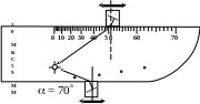 В этом же положении необходимо определить значение угла ввода УЗК по шкале «» образца СО‑3Р для середины используемого ПЭП. Для проверки угла ввода каналов «4» следует установить блок ПЭП на образец СО-3Р в положение соответствующее максимуму эхо-сигнала от отверстия диаметром 6 мм на глубине 44 мм.