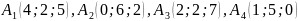 Найти: 1) длины ребер и ; 2) угол между ребрами и ; 3) угол между ребром и гранью ; 4) площадь грани ; 5) объем пирамиды ; 6) канонические уравнения прямой ; 7) уравнение плоскости ; 8) уравнение высоты, опущенной из вершины на грань и длину этой высоты. Для угловых величин кроме точного значения дать приближенное значение с точностью до (до одной угловой секунды). Сделать схематический рисунок с указанием всех рассматриваемых векторов.