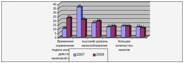 В соответствии с рисунком 13 в 2007 году на первом месте находилась такая проблема, как нестабильность налогового законодательства, а по результатам 2009 года она переместилась на второе по важности место. Одновременно пункт «высокий уровень налогообложения» переместился со второго места на третье. Это объясняется тем, что в новом Налоговом кодексе предусмотрено ограничение на внесение изменений и дополнений в части установления новых налогов, изменения налоговых ставок и налоговой базы действующих платежей. Также снижены ставки нескольких налогов и предусмотрена возможность применения специального налогового режима для субъектов малого бизнеса, применение которого, по нашему мнению, позволит предпринимателю сократить налоговую нагрузку и количество сдаваемой отчетности.
