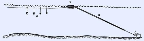 Донка с резинкой: а - резинка; б - груз-якорь; в - поплавок, регулирующий расположение крючков на разной глубине; г - буек-указатель места расположения груза-якоря; д - расположение поводков