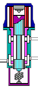 При подаче напряжения на электромагнит золотник поднимается вверх, перекрывая подвод масла в камеру над поршнем золотника АБ, который под действием давления масла снизу перемещается вверх и закрывает слив масла предельного регулирования. Через 10 сек. напряжение снимается и золотник взведения защиты под действием пружины опускается вниз, вновь открывая подвод масла к камере над золотником АБ. Но, так как он находится в верхнем положении, то это масло там «дежурит», обеспечивая тем самым готовность золотника к срабатыванию.