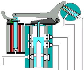 К корпусу закреплен кронштейн, на оси которого расположен клиновидный рычаг. При его повороте за счет механического воздействия бойка АБ, нажатия на кнопку "АО" или перемещения сердечника электромагнитного выключателя, золотник АБ перемещается на 1 - 2 мм и открывает подвод масла в верхнюю камеру золотника. Давлением этого масла золотник опускается на нижний упор и открывает слив масла предельного регулирования, обеспечивая останов ГПА.
