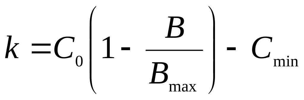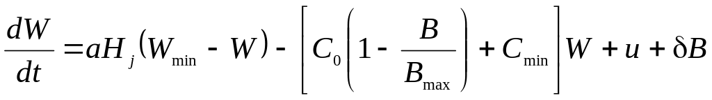 де W – обсяг пляжі- і наносоутворюючого матеріалу (починаючи з піщаних фракцій) на одиницю довжини берегової лінії (0<W<Wmin), м3; Wmin – граничний мінімальний обсяг уламкового матеріалу на пляжі, при якому абразія припиняється, м3; В – біомаса донного біоценозу на одиницю ширини абразивної обмілини (шельфу) (0<B<Bmax), т/м; Вmax – стаціонарний рівень біомаси донного біоценозу, т/м; а – частка пляже- і наносоутворюючого матеріалу в породах, що складають беріг (0<a<1); Н – висота берегового уступу, м; u – інтенсивність надходження (u>0) або віднесення (u<0) матеріалу за рахунок природних (плину) або штучних (підсипання, вилучення) факторів, м2/рік; – коефіцієнт біогенної продукції уламкового матеріалу (кількість уламкового матеріалу, одержуваного з однієї тонни біомаси в рік), м2/рік; t – час, рік; С0, Cmin = const>0, 1/рік; j=const>0,1, 1/м·рік; j(Wmin - W) – швидкість відступу берегового уступу, м/рік; k – коефіцієнт стиранності пляжеутворюючого матеріалу (0,06<k<0,1), 1/рік.
