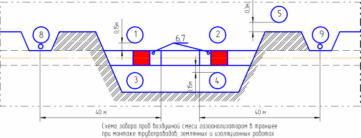 Контроль воздушной среды в котлованах проводится только после очистки траншеи и поверхности нефтепровода от остатков нефти и горючих материалов. Воздушная среда должна контролироваться не менее чем в трех точках по всей длине котлована, плюс 1 точка на каждые 10 м увеличения длины котлована.