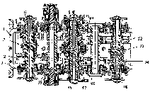 1 – стяжний болт; 2, 5, 12 та 14 – шестерні вторинних валів; 3 та 13 – зубчаті муфти; 4 – призонний болт; 6 - вторинний вал правого борта; 7 – проміжний блок шестерень приводу правого борта; 8 – шліцьова втулка; 9 – муфта блокування диференціала; 10 - шестерня приводу правого борта; 11 – міжбортовий диференціал; 15 – вторинний вал лівого борта; 16 – проміжний блок шестерень приводу лівого борта; 17 – шестерня приводу лівого борта; 18 - первинний вал; 19 – вал приводу водометів