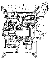 1- ведена шестерня; 2 і 18 - роликопідшипники; 3, 15 і 22 - стакани;4 - регулююча прокладка; 5, 17 і 24 - кришки підшипників; 6 і 16 фланці; 7 - подовжувач; 8 - пневмоперемикач; 9 - поршень; 10 - вимикач; 11 - шток; 12, 14 і 29 - шестерні; 13 - вилка; 19 - муфта; 20- маточина; 21- вал приводу водометів; 23 і 31 - кулькопідшипники; 28 - маслоприймач з сіткою і магнітом; 30 - вал масляного насосу; 32 - масляний насос