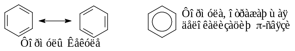 Таким образом, молекула бензола содержит секстет π-электронов, находящихся на замкнутых делокализованных π- молекулярных орбиталях и обладающих высокой степенью симметрии, что обеспечивает повышенную энергетическую стабильность молекулы (энергия стабилизации бензола составляет 151 кДж/моль). Поэтому в настоящее время формулу бензола можно изображать следующим образом: