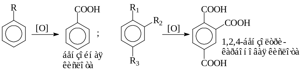 У гомологов бензола, в первую очередь, окисляются боковые цепи, а бензольное ядро не изменяется. Как бы ни была сложна боковая цель, она при действии сильных окислителей разрушается, и лишь углерод, непосредственно связанный с ядром, не отрывается от него и превращается в карбоксильную группу (COOH). Таким образом, любой гомолог бензола с одной боковой цепью окисляется в однооснов-
