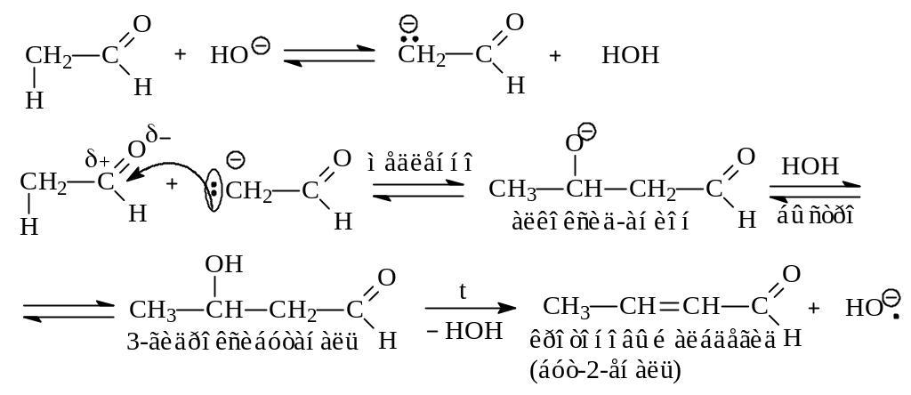 Кетонную и енольную формы называют таутомерами, а их взаимный переход – кето–енольной таутомерией. Вследствие С–Н- кислотности альдегиды и кетоны в присутствии оснований способны самоконденсироваться, образуя вначале β-гидроксикарбонильные соединения (альдоли или кетолы), которые при умеренном нагревании отщепляют воду, превращаясь в α,β-ненасыщенные карбонильные соединения (А. Бородин, 1872 г.):