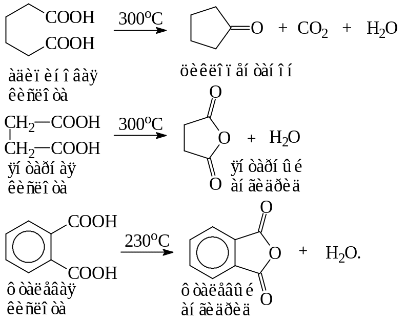 Некоторые дикарбоновые кислоты циклизуются при декарбоксилировании, если возможно образование устойчивых 5- и 6-членных циклов: