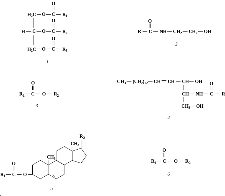 1 – триацилглицерины; 2 – N-ацилэтаноламиды; 3 – воски; 4 – церамиды;