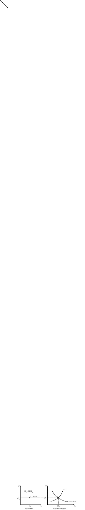 Отдельная фирма на конкурентном рынке труда покупает незначительную долю трудовых ресурсов и не может повлиять на их цену. Поэтому кривая предложения труда для отдельной фирмы абсолютно эластична и задаётся уровнем равновесной заработной платы (SL=WE), которая определяет предельные и средние издержки труда фирмы (WE=MRCL=АRCL). Точка пересечение кривых индивидуального спроса на труд (DL=MRPL) и предложения труда для фирмы (SL=WE) задаёт количество труда, используемого фирмой (LE), при котором соблюдается правило максимизации прибыли: MRPL=MRCL=WЕ.