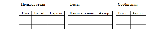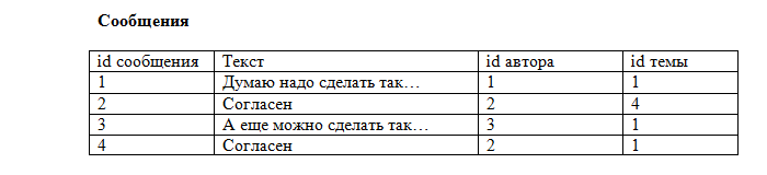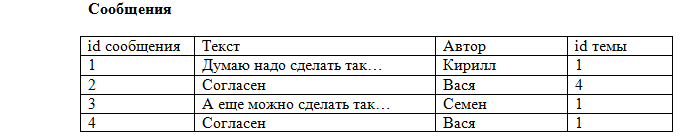 Предположим, мы захотели создать базу данных для форума. У форума есть зарегистрированные пользователи, которые создают темы и оставляют сообщения в этих темах. Эта информация и должна храниться в базе данных. Теоретически (на бумаге) мы можем все это расположить в одной таблице, например, так: