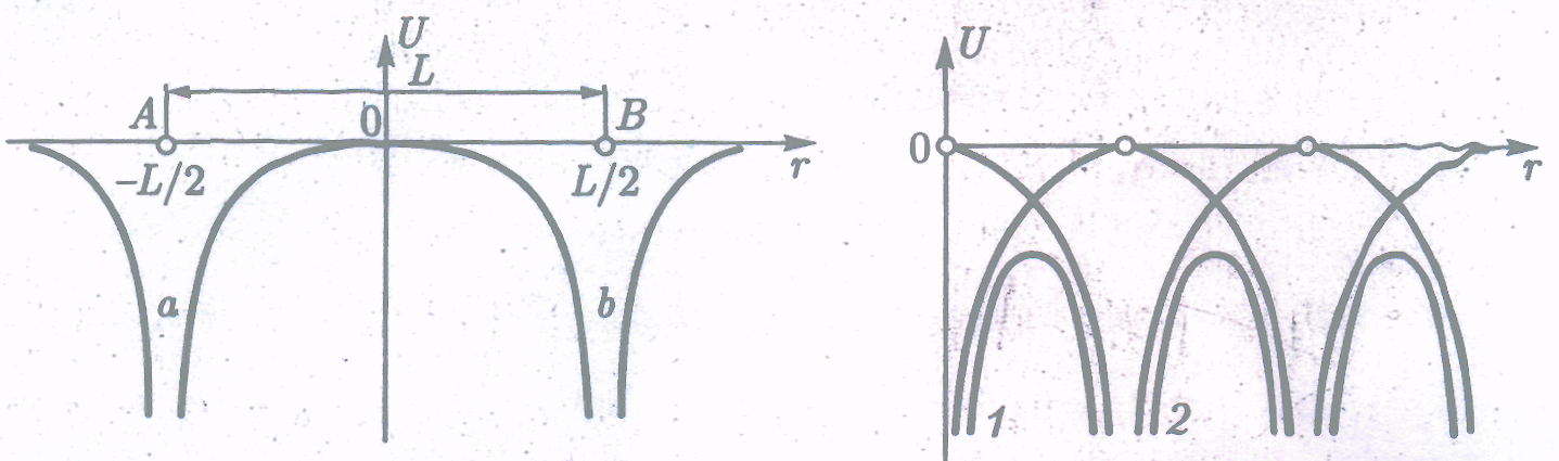 Энергетические уровни электронов в атомах, находящихся в возбужденных состояниях, имеют конечную ширину ∆Wn,l, связанную с соотношением неопределенности для энергии и времени. Согласно второй из формул (37.15), имеем ∆Wn,l τn ≥ h. Время жизни атома в возбужденном состоянии τn совпадает с временем жизни электрона в этом состоянии, τn ≈ 10-8с. В 39.7 обсуждался вопрос о значении τn и естественной ширине энергетического уровня ∆Wn,l: ∆Wn,l ~h/ τn ≈ 10-25Дж ≈ 10-6эВ. Как видно, эта ширина гораздо меньше, чем расстояние между уровнями, имеющее порядок ~ 1 эВ. В кристаллах расстояния между атомами столь мало (L~d~10-10 м), что происходит перекрытие их электрических полей. Потенциальные кривые, разграничивающие соседние атомы, частично накладываются друг на друга и дают потенциальные кривые для электронов типа 1-2 (рис.43.2). Из рисунка видно, что происходит понижение и сужение потенциального барьера для валентных электронов атомов. В этих условиях существенную роль играет туннельный эффект, с помощью которого электрон «уходит» от своего атома и переходит к соседнему.