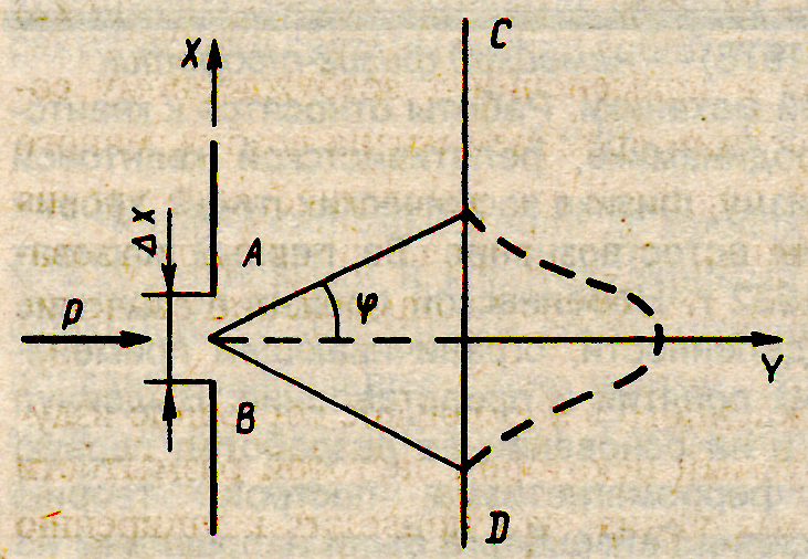 Так как каждый электрон до щели движется в пучке перпендикулярно плоскости щели, то составляющая импульса рx = 0, но координата х электрона неопределенная. В момент прохождения щели электрон имеет координату, равную координате щели. В определении координаты электрона содержится неопределенность, зависящая от размеров щели: Δx = α. При дифракции появляется составляющая импульса рx, неопределенность составляющей импульса зависит от угла φ: