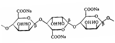 Звенья полигулуроновой и полиманнуроновой кислот, связанные в основном β-(1,4)-гликозидными связями, с небольшими разветвлениями. Соотношение маннуроновая: гулуроновая кислота меняется в зависимости от вида водорослей от 1:0,4 до 1:1,9.