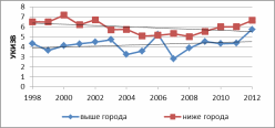Рис.2. Динамика изменения качества воды р. Вологда выше и ниже города