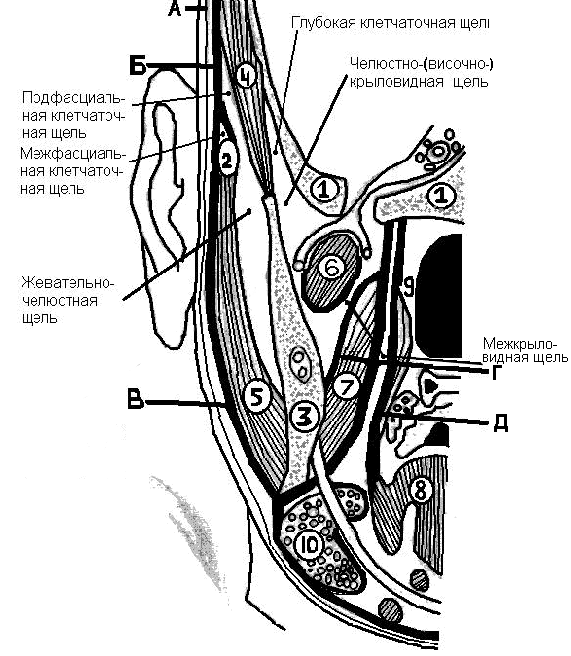 1 – кости основания черепа, 2 – скуловая дуга, 3 – ветвь нижней челюсти, 4 – височная мышца, 5 – жевательная мышца, 6 – латеральная крыловидная мышца, 7 – медиальная крыловидная мышца, 8 – мышцы языка, 9 – глотка, 10 – поднижнечелюстная слюнная железа. А – поверхностная фасция, Б – височная фасция, В – околоушно-жевательная фасция, Г – межкрыловидная фасция, Д – окологлоточная фасция.
