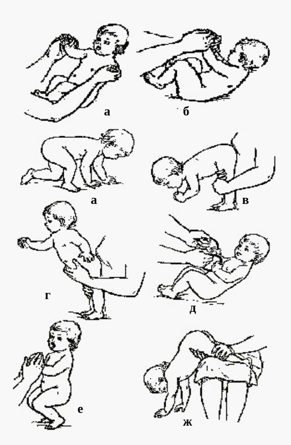 Әуелі ішінде жатқан баланы тап сол жағдайда көтерсе – бала басын артқа қарата шалқайтады. Бір айдан кейін (төрт айлығында) тап сол жағдайда баланың барлық денесі доға түрінде иіліседі. Осы қимылға байланысты баланың вестибулярлы аппараты қатаяды. Төрт айдан бастап арқасында орналастырған баланы көтергенде, бала басын алға еңкейтіп, денесінің алдынғы жағының бұлшық еттерін ынталандырады. Баланы осындай жағдайларда тұрақты ұстай берсе, баланың мойын, дене бұлшық еттерін нығайтуға болады.