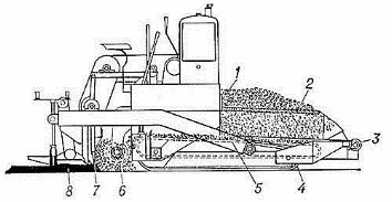 Технологічна схема укладаьника важкого типа на гусеничному ходу: 1 — шиберниє заслінки; 2 — бункер; 3 — буферні ролики; 4 — гусеничний хід; 5 — скребкові живильники; 6 — розподіляючі шнеки; 7 — трамбуючий брус; 8 — вигладжуюча плита.