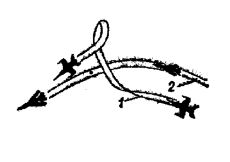 Рис.7. Маневр "ножницы с бочкой" (1 - траектория полета истребителя, 2 - траектория полета цели) |