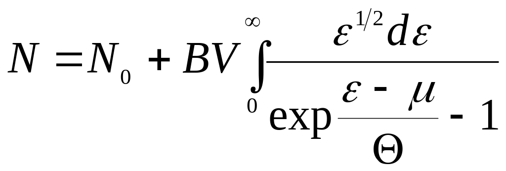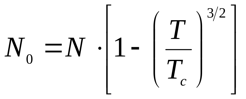 який виражає кількісне накопичування бозонів (від загальної їх кількості) на нульовому енергетичному рівні нижче температури . Як бачимо з (14.42), в цій області температур число частинок на найнижчому рівні стає порівняним з повною їх кількістю. Таке явище називають бозе-ейнштейнівською конденсацією, а – температурою бозе-конденсації.