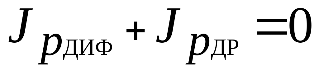 Таким чином, нерухомі заряди утворюють електричне поле, значення якого пропорційне розмірам заряджених ділянок, а напрям такий, що обумовлює дрейф електронів або дірок назустріч дифузійному потоку. Тому підсумкове перенесення носіїв даного типу можна розглядати як різницю між перенесенням внаслідок дифузії та перенесенням внаслідок дрейфу. При рівновазі дрейфові та дифузійні компоненти електронних i діркових потоків зрівноважують один одного i повний струм у зовнішніх виводах дорівнює нулю. На рис. 2.2, (а) стрілками показані складові струмів. Електронно-дірковий перехід за відсутності зовнішнього поля автоматично досягає стану термодинамічної рівноваги, коли дифузійний струм у переході, обумовлений градієнтом концентрації носіїв заряду, зрівноважується зустрічним дрейфовим струмом, обумовленим напруженістю внутрішнього електричного поля в переході Ек :
