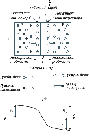 Розглянемо фізичні процеси, які відбуваються при утворенні різкого (східчастого) переходу в напівпровіднику з різними типами провідності за відсутності зовнішнього електричного поля .