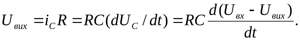 Схема ємнісного диференціюючого кола показана на рис. 8.6, а. Вхідна напруга Uвх прикладається до всього кола, а вихідна знімається з резистора R. Струм, що протікає через конденсатор, зв'язаний з напругою па ньому відомим співвідношенням іС = С(dUC /dt ). Враховуючи, що той же самий струм протікає через резистор R, запишемо вихідну напругу: