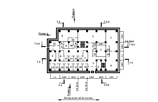 1 – вестибюль; 2 – гардероб; 3 – комната переодевания; 4 – тренажерный зал; 5 – тренажерный зал; 6 – раздевалка мужская; 7 – раздевалка женская; 8 – душевые; 9 – сауна мужская; 10 – сауна женская; 11 – санузлы; 12 – преддушевые; 13 – тамбуры; 14 – кладовая; 15 – тренерская; 16 – комната отдыха; 17 – кабинет врача; 18 –кабинет медицинской сестры; 19 – комната персонала; 20 – комната администратора; 21 – радиоузел; 22 – комната дежурного администратора; 23 – кладовая; 24 – снарядная