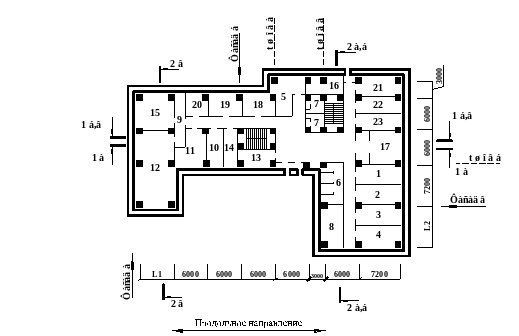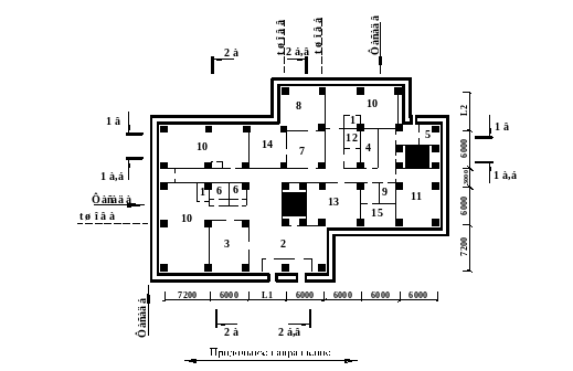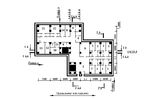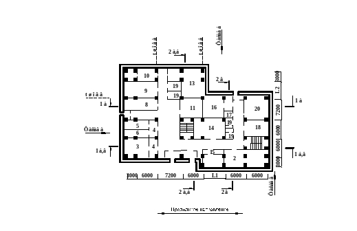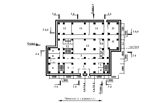 1 – умывальные; 2 – вестибюль; 3 – гардероб; 4 – кладовая уборочного инвентаря; 5 – электрощитовая; 6 – санузел; 7 – приёмная; 8 – кабинет директора; 9 – кладовая; 10 – мастерские; 11 – учебная аудитория; 12 – душевые; 13 – методический кабинет; 14 - кабинет завуча; 15 – кабинет медсестры