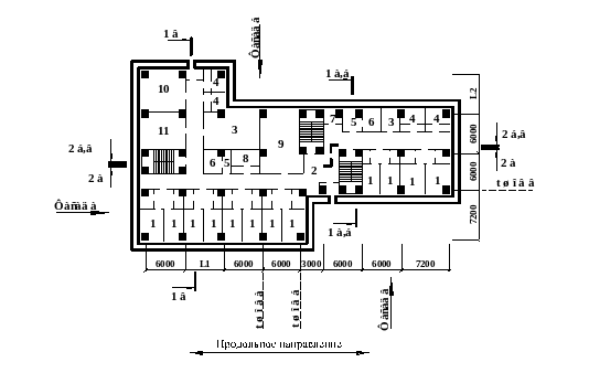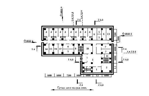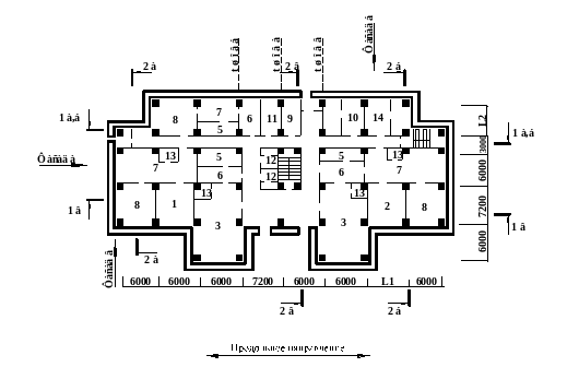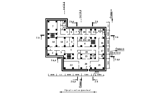 1 – кабинет заведующей; 2 – кабинет персонала; 3 – игровая столовая; 4 – фойе; 5 – туалетные; 6 – раздевальные; 7 – групповые; 8 – спальни; 9 – техническое помещение; 10 – столовая персонала; 11 – хозяйственная кладовая; 12 – уборные персонала; 13 – подсобные помещения; 14 – кабинет медсестры