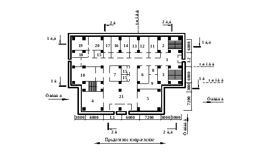 1 – зал обслуживания населения; 2 – ассистентская; 3 – помещение хранения торгового запаса; 4 – регистратура; 5 – гардероб; 6 – стерилизационная; 7 – антисептическая; 8 – шлюз; 9 – стерилизационная; 10 – кабинет заведующего; 11 – помещение приёма и обработки лекарственного сырья; 12 – кладовая хранения легковоспламеняющихся жидкостей; 13 – распаковочная; 14 – дезинфекционная; 15 – уборные; 16 – кладовая вспомогательного материала; 17 – душевая; 18 – кладовая хозяйственного инвентаря; 19 – бельевая; 21 - вестибюль