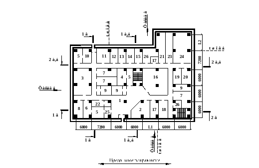 1 – помещение для приема передач больным; 2 – заготовочная концентратов и полуфабрикатов; 3 – аналитическая; 4 – ассистентская; 5 – помещение для лекарственных препаратов; 6 – помещение для хранения вспомогательных материалов; 7 – стерилизация лекарственных форм; 8 – дистилляционная-стерилизационная; 9 – моечная; 10 – дезинфекционная; 11 – бухгалтерия; 12 – архив; 13 – помещение для хранения перевязочных средств; 14 – помещение для хранения дезинфекционных средств и кислот; 15 – кабинет заведующего аптекой; 16 – аптека; 17 – информационная; 18 – помещение для сушки и стирки рабочей одежды; 19 – бельевая; 20 – гардеробная; 21 – регистратура; 22 – помещение для прививок; 23 – уборная; 24 – кабинет врачей педиатров:25 – процедурная для детей; 26 – фильтр-блок для детей.