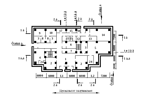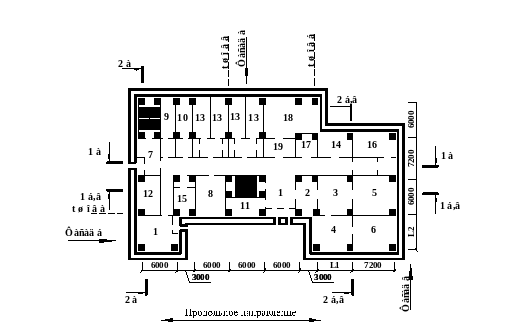 1 – умывальные; 2 – вестибюль; 3 – гардероб; 4 – кабинет завуча; 5 – кабинет директора; 6 – методический кабинет; 7 – кабинет медсестры; 8- учительская; 9 – кладовая; 10 – туалет; 11 – учебная аудитория; 12 – электрощитовая; 13 – кинозал; 14 - киноаппаратная; 15 – комната технического персонала; 16 – мастерская