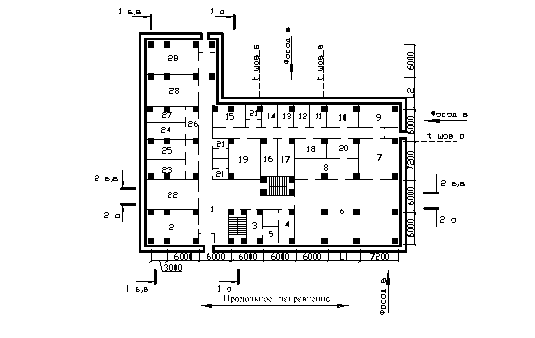 1– вестибюль; 2 – гардероб; 3 – кабинет врача; 4 – кабинет зубного врача, 5 – процедурный кабинет; 6 – обеденный зал; 7 – горячий цех; 8 – моечная столовой посуды; 9 – колодный цех; 10 – доготовочный цех; 11 –кладовая овощей; 12 – кладовая сухих продуктов; 13 – охлаждаемая камера; 14 – кладовая инвентаря; 15 – комната персонала; 16 – женский гардероб; 17 – мужской гардероб; 18 – бельевая; 19 – комната заведующего производством; 20 – моечная кухонной посуды; 21 – санузлы; 22 – методический кабинет; 23 – архив; 24 – кабинет директора; 25 – канцелярия; 26 – приемная; 27 – кабинет заместителя директора; 28 – архив вечернего отделения; 29 – помещение учебных пособий; 30 – учебная часть; 31 – бухгалтерия.