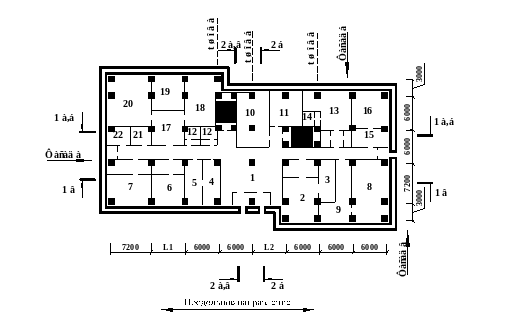 1 – вестибюль; 2 – салон срочного ремонта обуви; 3 – кладовая обуви; 4 – пункт приёма белья в стирку; 5 – пункт выдачи чистого белья; 6 – кладовая пункта проката; 7- мастерская ремонта металлоизделий; 8 – прачечная самообслуживания; 9 – ожидальная приёма белья; 10 – химчистка; 11 – кладовая пункта химчистки; 12 – санузлы; 13 - комната персонала; 14 – душевая персонала; 15 – салон ремонта бытовой техники; 16 - мастерская ремонта бытовой техники; 17 – салон парикмахерской; 18 – женский зал парикмахерской; 19 – педикюрный кабинет; 20 – косметический кабинет; 21 – подсобное помещение; 22 – кладовая уборочного инвентаря