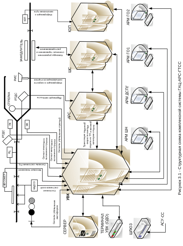 Система горочной автоматической централизации и автоматизированного регулирования скорости скатывания отцепов ГАЦ-АРС ГТСС представляет собой совокупность математических и логических методов, средств вычислительной техники, средств сопряжения устройств СЦБ и вычислительной техники, сетевого коммуникационного оборудования, специализированного оборудования, а также действий оперативного персонала.
