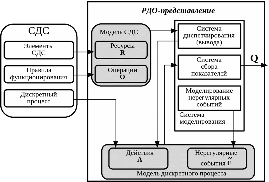 Модель СДС в РДО-методе представляет собой динамическую продукционную систему. Базой данных (БД) этой продукционной системы является множество ресурсов , базой знаний (БЗ) - множество операций . Адаптация к конкретной СДС заключается в формализованном описании ресурсов и операций на некотором языке и введении их в БД и БЗ.