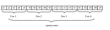 Хромосома в рассматриваемой задаче состоит из 4-х генов: a, b, c и d. Поскольку ген является целым числом, меньшим 30, для кодирования каждого гена можно использовать 5 битов. Тогда хромосома имеет вид, показанный на рис. 1.10.