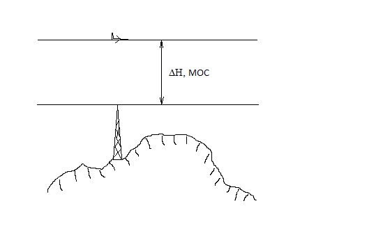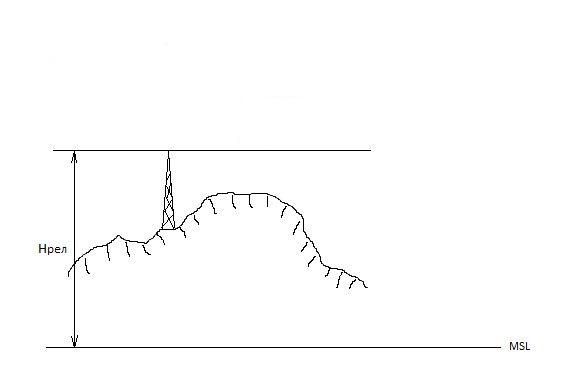 Высота препятствия Hрел , но имеется в виду наивысшая высота рельефа с учетом исскуственных препятствий в определенной зоне учета препятствий, размеры которой учитывают возможные отклонения ВС от ЛЗП.