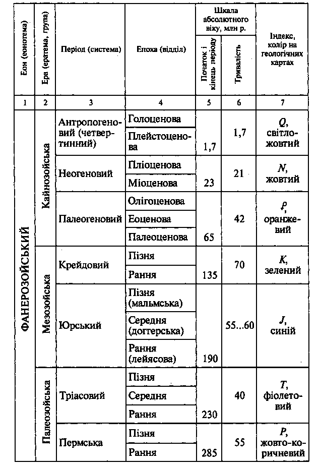 Тривалість ер різна: архейської – 1400 млн р., протерозойської – 2030, палеозойської – 340, мезозойської – 165 і кайнозойської – 65 млн р. (незавершена), періоди тривали 20...100 млн р. (в середньому близько 50 млн р.), епохи – 6...30, віки – 8... 10 млн р. і часи – сотні тисяч років.