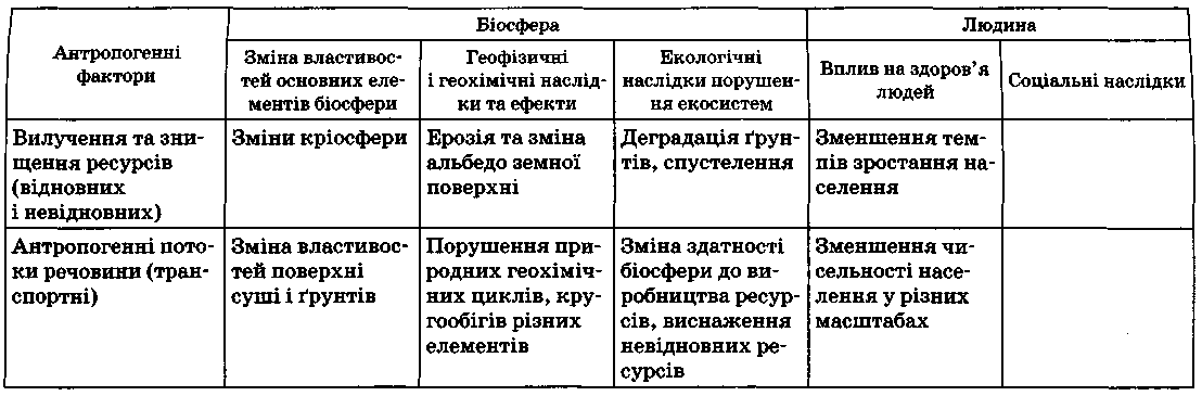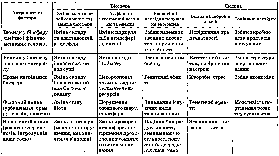 Можливі наслідки антропогенно-техногенного впливу людини на біосферу відображені у табл. 4.4.