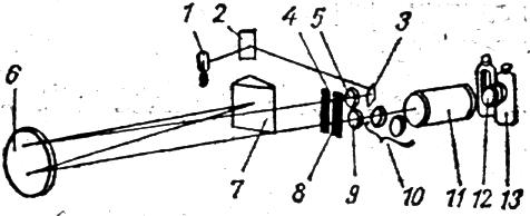 В основі приладів, починаючи з СФ-4, лежить загальна принципова оптична схема (рис. 2.11). Світло від джерела (1) попадає на дзеркальний конденсор (2), потім на плоске дзеркало (3). Дзеркало відхиляє промінь на 900 і направляє його в щілину (4) (автоколімаційного монохроматора з 300 - ю призмою), яка захищена пластинкою (5). Потім світло попадає на призму диспергування (7), яка розкладає його в спектр; диспергований потік направляється знову на об'єктив, який фокусує промені в щілину (8). Призма сполучена за допомогою спеціального механізму зі шкалою довжини хвиль. Повертаючи призму за допомогою відповідної ручки на виході монохроматора, отримують монохроматичний потік світла заданої довжини хвилі, який, пройшовши щілину (8), кварцову лінзу (9), фільтр (10) поглинаючий розсіяне світло, еталон (або зразок) і захисну пластинку (12), попадає на фотоелемент (13).